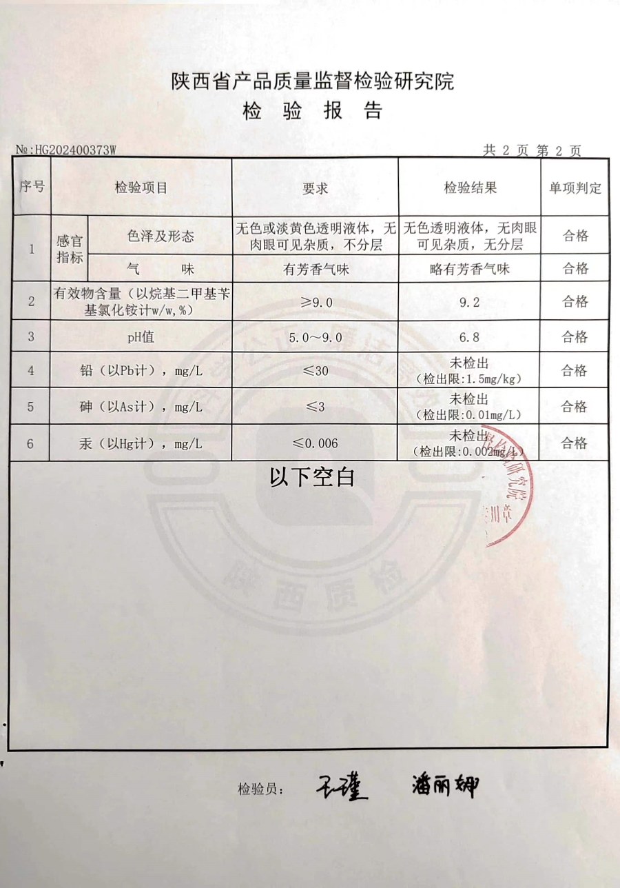 欣諾華牌復合季銨鹽消毒液檢測報告(2024年度)-陜西欣諾華生物科技有限公司