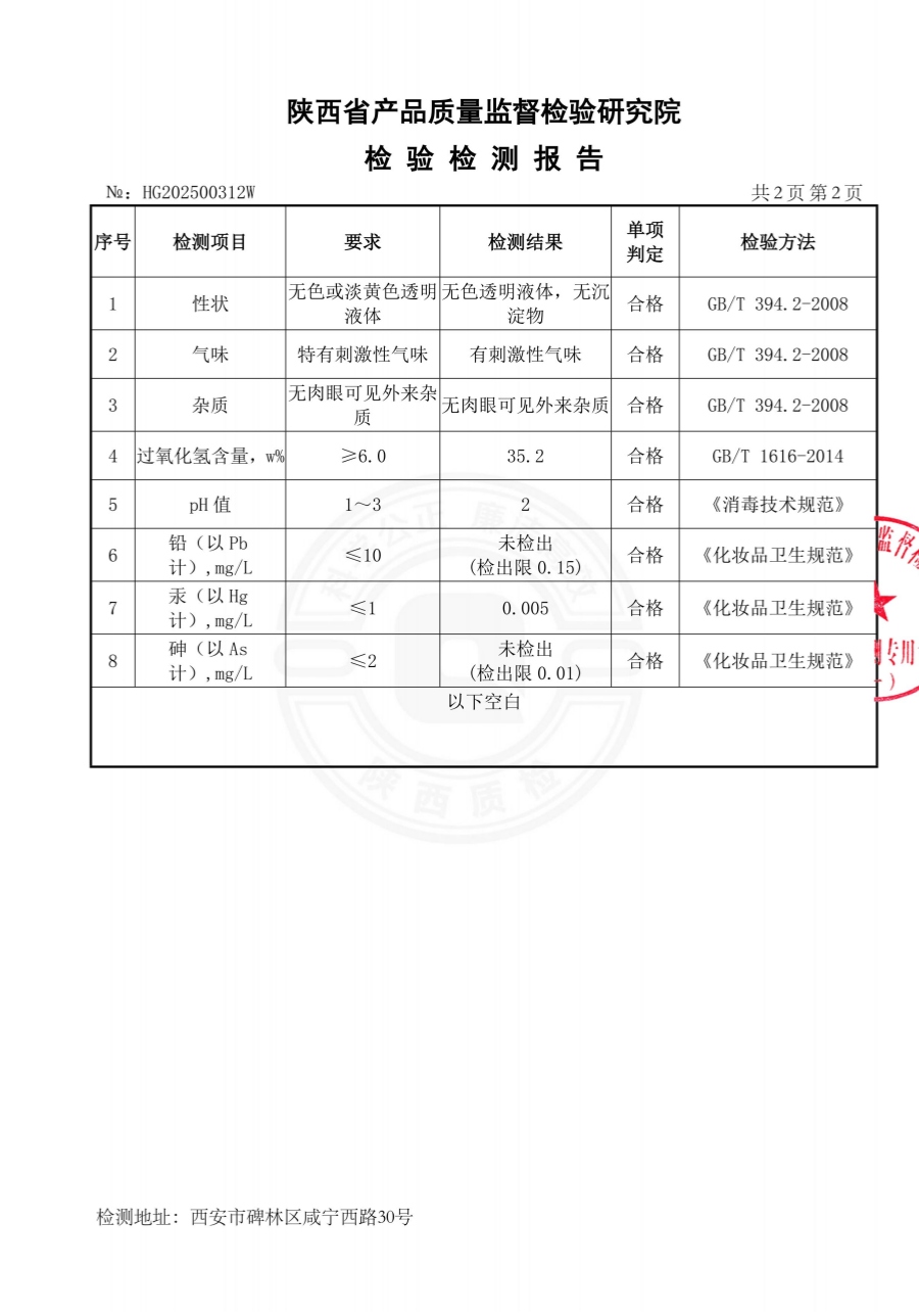 欣諾華牌過氧化氫消毒液(食品級(jí)雙氧水)檢測(cè)報(bào)告(2024年度)-陜西欣諾華生物科技有限公司